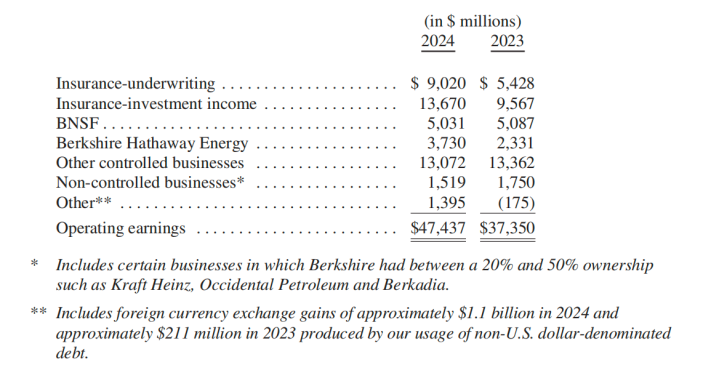 2024年,我们实现了474亿美元的营业利润。相较于年报K-68页上按通用会计准则(GAAP)要求列示的利润,营业利润能够更真实地经营状况。我们采用的指标排除了我们持有的股票和债券的资本利得或资本损失,从长期来看,我们认为利得胜出的可能性很高,否则我们为什么要购买这些证券呢?